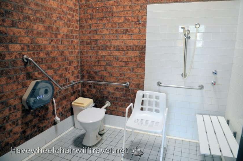 A refundable $10 deposit is required in return for the key to the accessible bathroom in the amenities block. The bathroom is equipped with a shower bench and a shower chair which is great as I know our readers often have a preference in this regard. Grab rails are fitted throughout and there’s a height-adjustable hand-held shower. There are no lever taps.