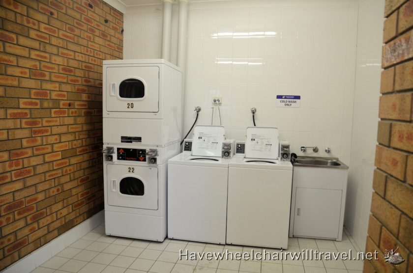 There are two laundry facilities in the park. The laundry facilities closest to the Wheelchair Friendly Villa are accessible. The laundry facilities in the middle of the park has one step up to it.