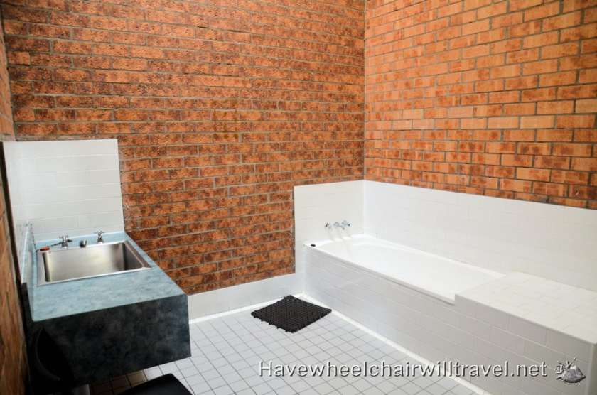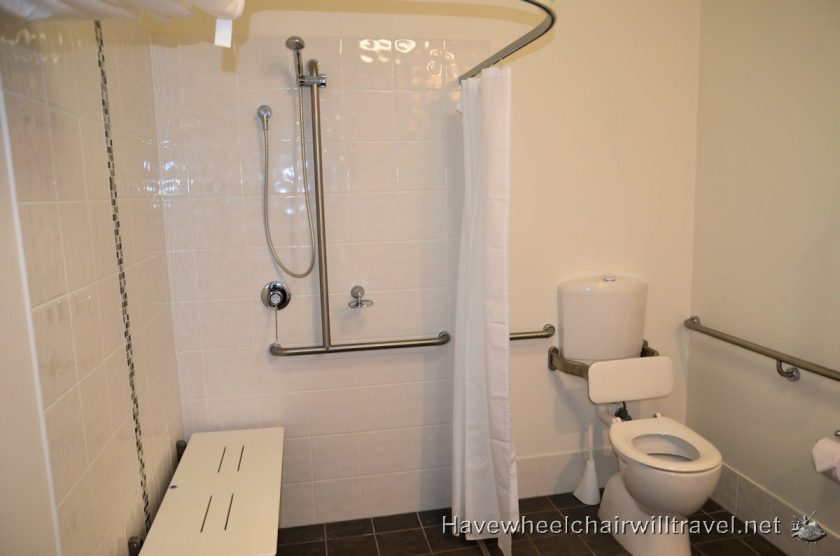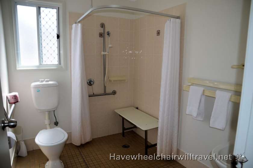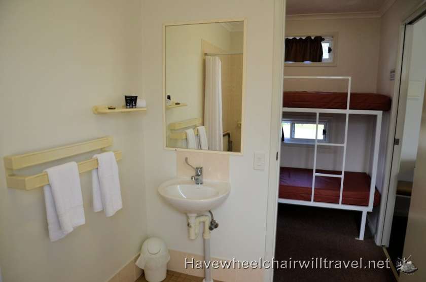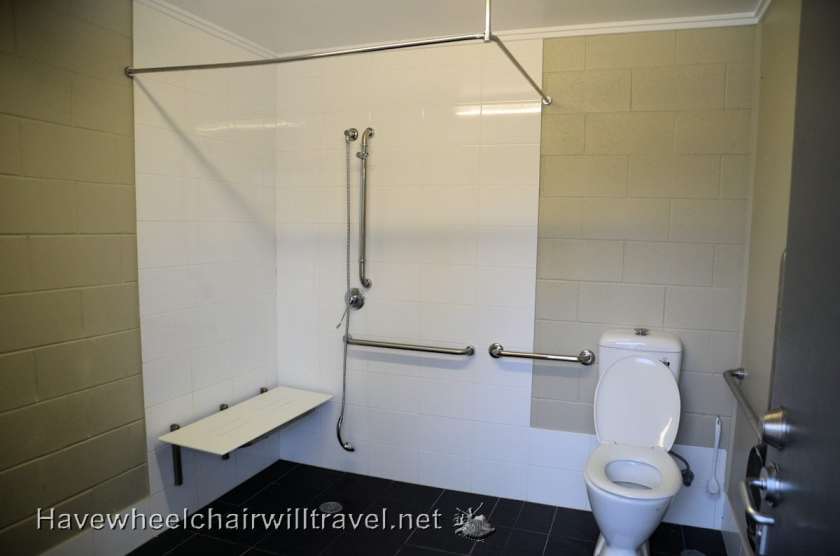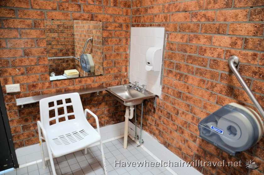A refundable $10 deposit is required in return for the key to the accessible bathroom in the amenities block. The bathroom is equipped with a shower bench and a shower chair which is great as I know our readers often have a preference in this regard. Grab rails are fitted throughout and there’s a height-adjustable hand-held shower. There are no lever taps.