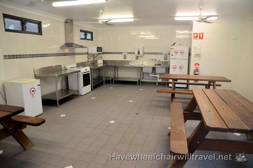 The camp kitchen has a fridge, microwave (though too high for a wheelchair user), oven, washing up facilities and seating.