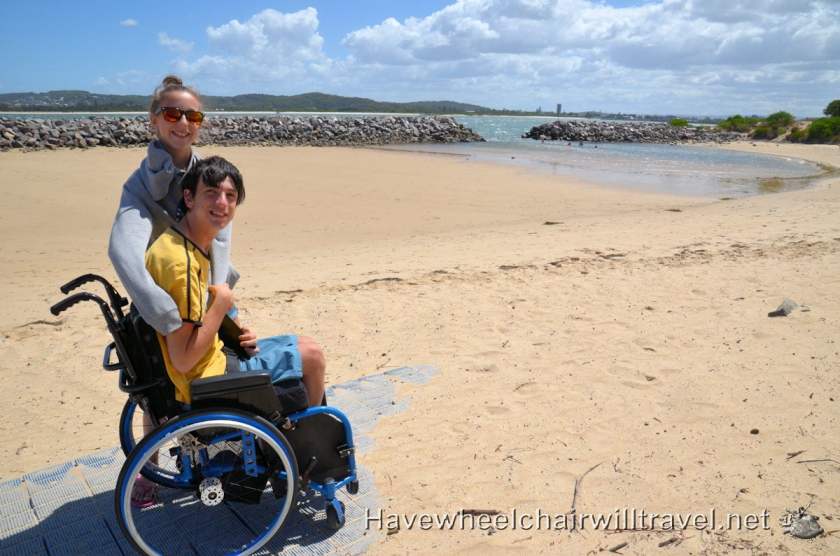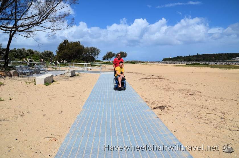 When we travel I always ask locals for their tips on the best places in the area. Last weekend a couple of people suggested we check out the new improved access to Grannies Pool and Swansea Channel Breakwall at Blacksmiths Beach. A ramp leads from the parking area to the beach and I was then delighted to find an accessible path over the sand making beach access possible. The wind was whipping up the sand so it had buried the very end of the pathway but we could see it would usually take a wheelchair user to the hard sand.