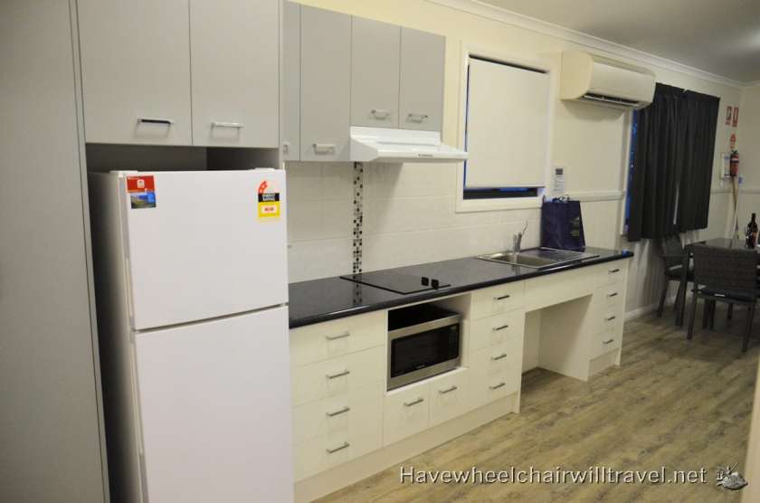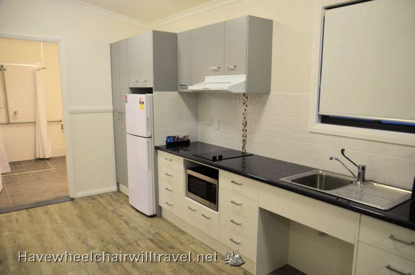 The galley kitchen has a lowered bench, room under the sink for wheelchair access and a lever tap. All crockery is at a level ideal for a wheelchair user.