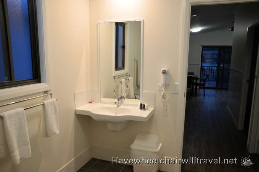 The bathroom basin is wheelchair accessible and has a lever tap.