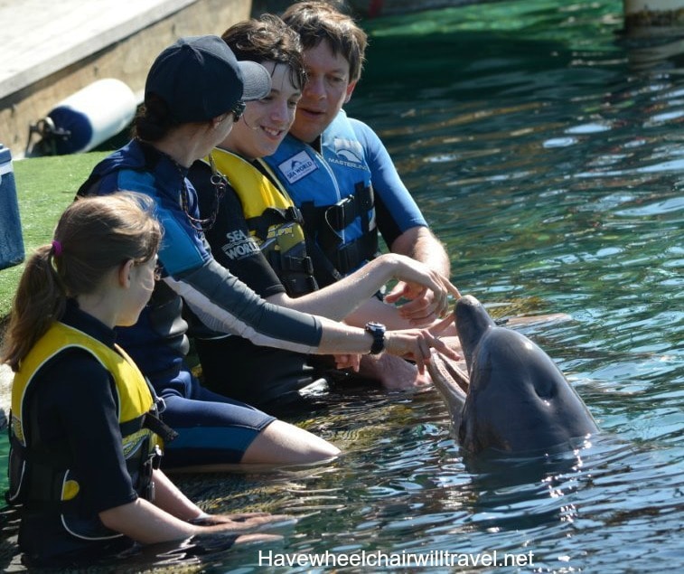 When we purchased a special needs dolphin experience for Braeden at Sea World Hubby went for free as his companion.