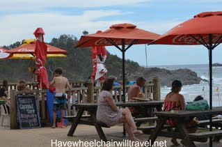The lifesavers were helpful in getting us the beach wheelchair and generally having a chat about water temp and conditions (only time I’m interested is when I’m on holidays!) There is a fantastic disabled parking spot right beside the surf club which means you can bring the beach wheelchair to the car and avoid extra transfers. There is also a stand alone disabled toilet/change facility at the surf club.