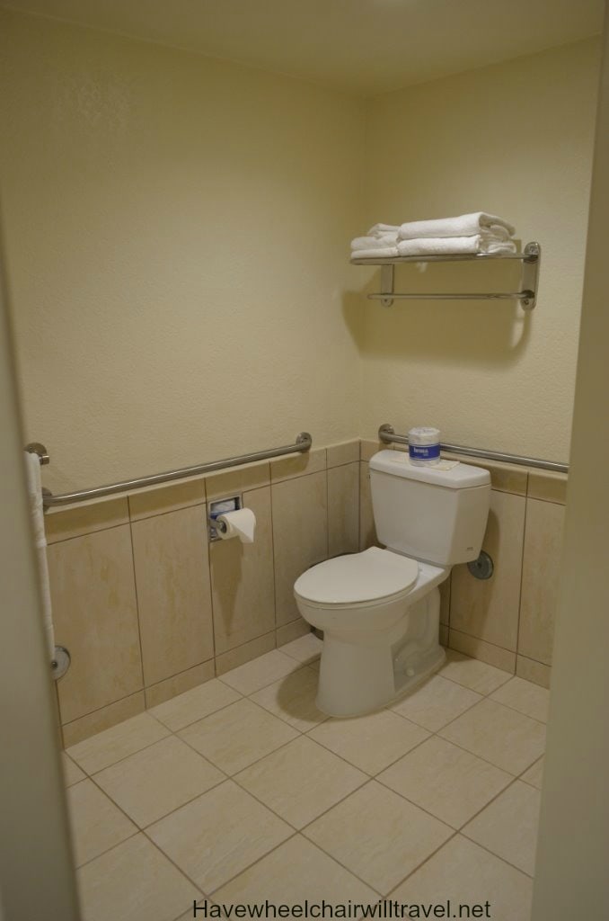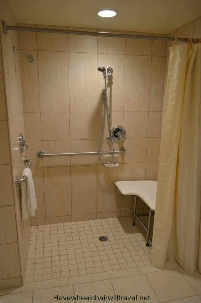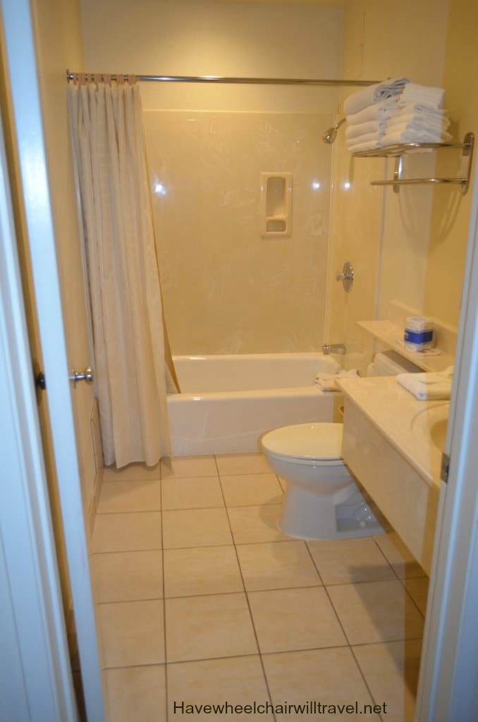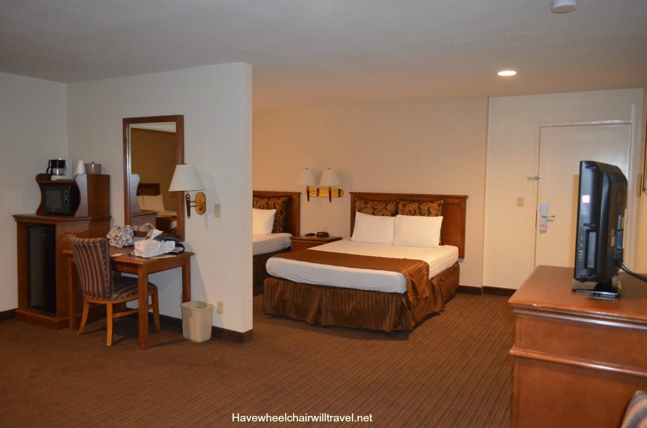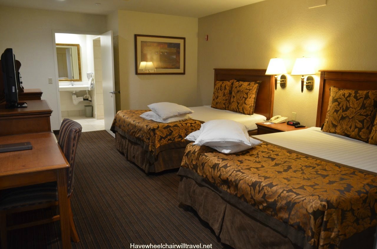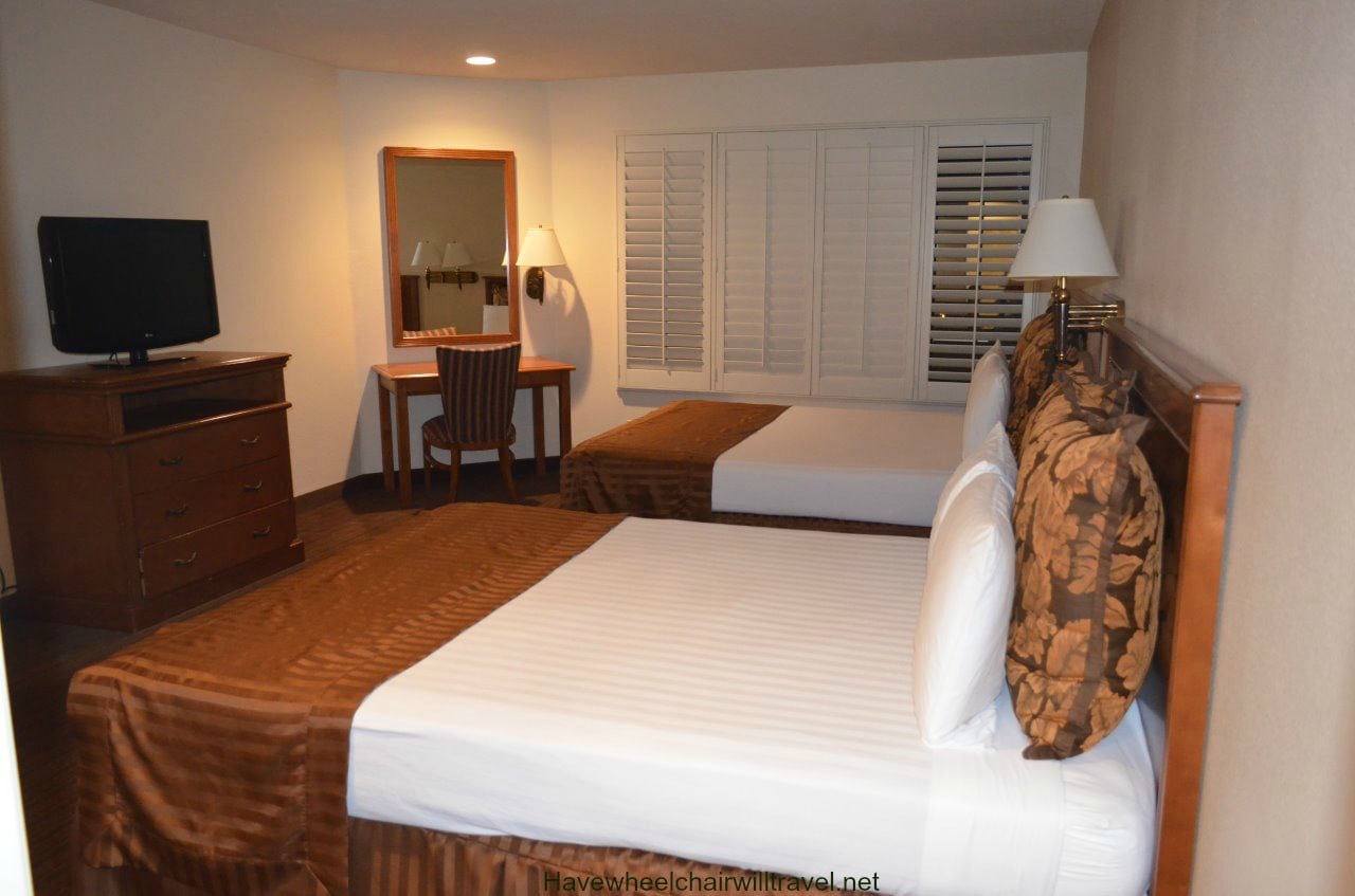 While staying at Desert Inn & Suites we took the opportunity to inspect one of the hotel’s accessible rooms. The accessible bathroom has a shower with flip down shower seat, hand held shower head and toilet with sufficient room to transfer. A lowered hanging rack for clothing, ironing board and iron are also located in the bathroom. The accessible room was a standard room so is better suited to couples as it is not as spacious as a suite but there is ample room for a wheelchair. Although it is able to accommodate a family of four with the bedding configuration, I did wonder how comfortable it would be with luggage and a wheelchair squeezed into the room.