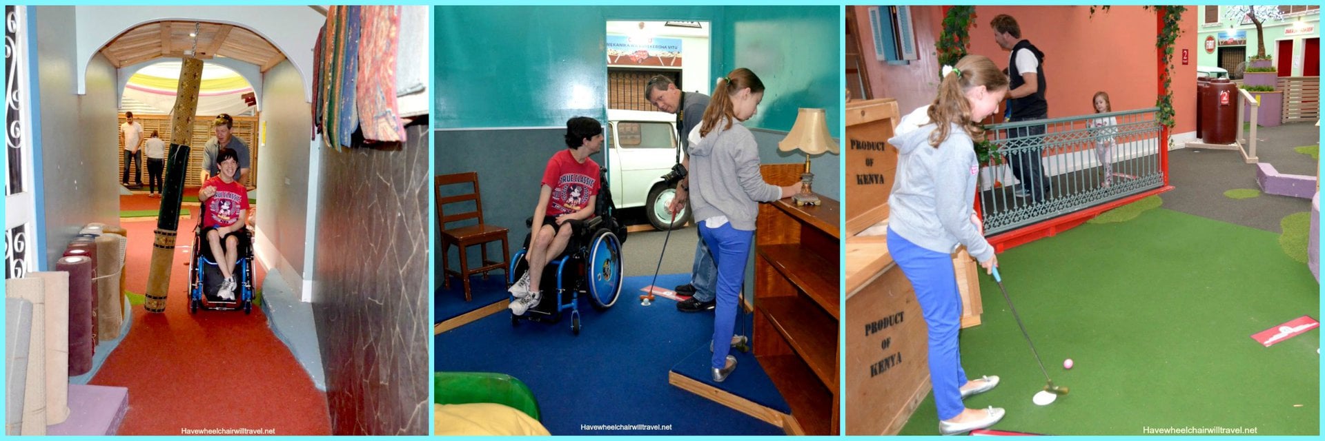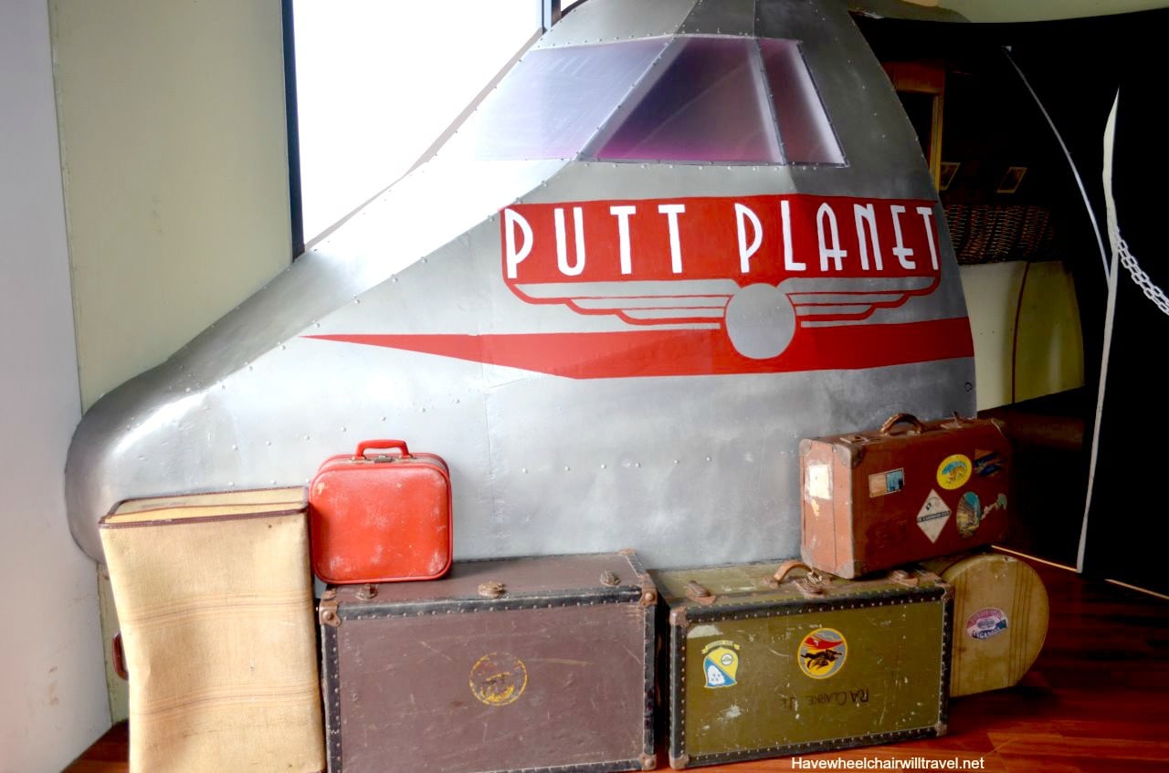 When we arrived at Putt Planet we were impressed to see a ramp to the front door, and an accessible entrance into the actual golf course inside. Â Once inside we were thrilled with the unique theme and the eclectic travel related decorations and props.