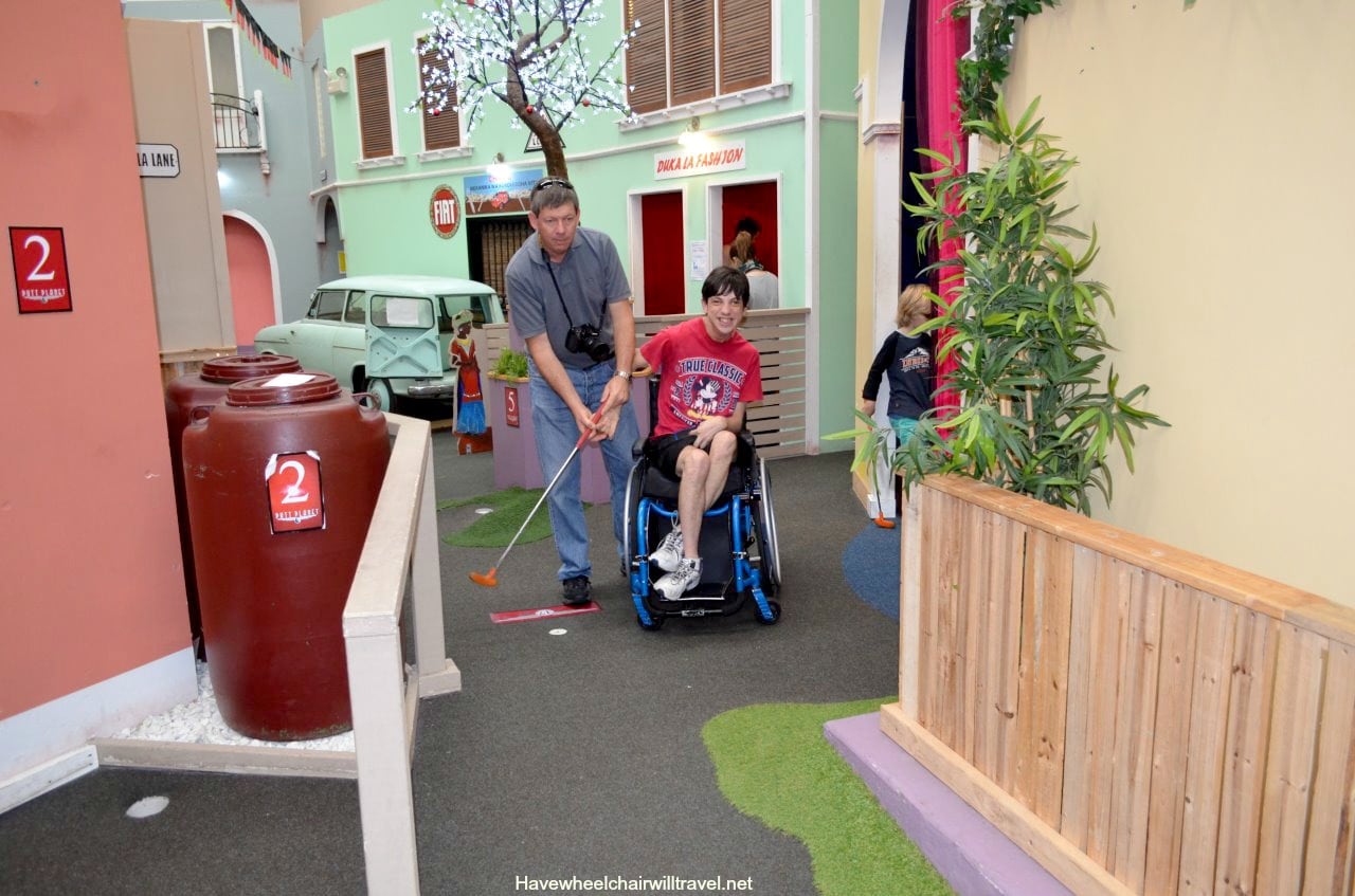 The course has doorways wide enough for Braeden’s wheelchair, no stairs or borders which made getting around a breeze.  We found some of the rooms a little tight  for Braeden to putt from his wheelchair but we managed to get around it.  On a whole it is the most accessible course we have come across and we have tried many.