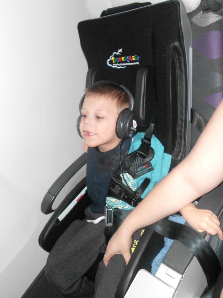 An upper torso harness can assist passengers with poor torso control and these are available on many aircraft. These can be requested through the airline’s Priority Assistance or special handling department. Braeden has used the harness and it worked well to keep him comfortably seated but sadly it didn’t make the flying time go any quicker. The harness can be used from 2 years old to an adult.